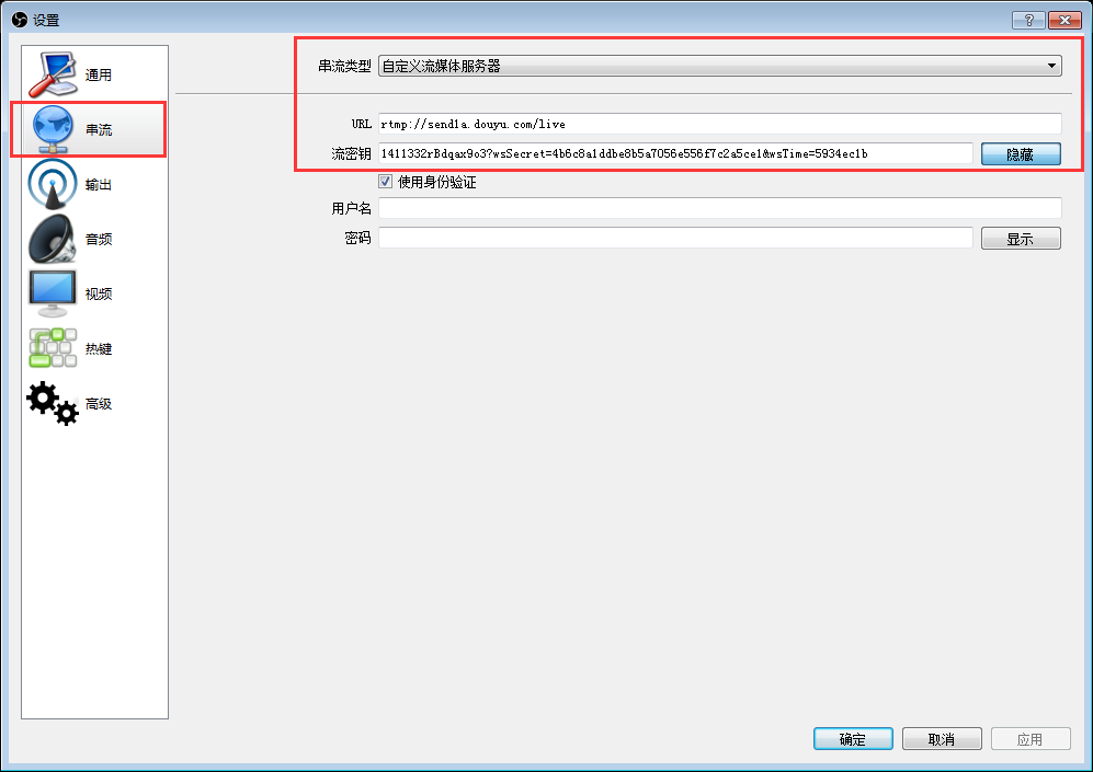 8. OBS Studio視頻直播,點擊“設置”,在彈出的視窗中,點擊“串流”,在“串流類型”旁下拉框里選擇“自定義流媒體服務器”,復制直播平臺的RTMP地址到“ULC”欄,復制直播平臺的直播碼到“流密鑰”欄,點擊“確定”保存,回到主界面點擊“開始串流”進行視頻直播