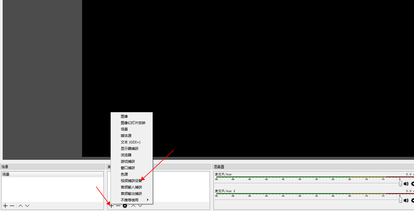 4. 雙擊打開OBS Studi軟件,點擊“來源”窗口下的“+”圖標,在彈出的窗口中點擊“視頻捕獲設備”,然后點擊確定;如圖: