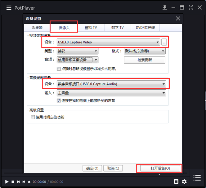 4. 點擊“攝像頭”,視頻錄制設備“設備”選擇思非電子采集卡,音頻錄制設備“設備”選擇思非電子采集卡,然后點擊“打開設備”