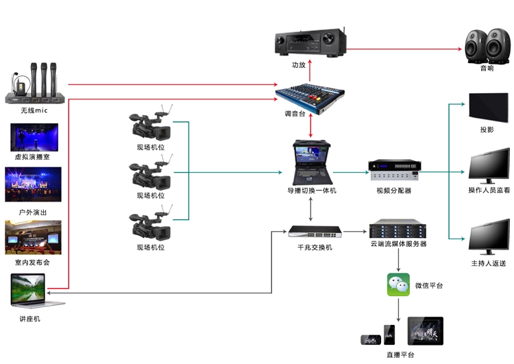 ★政府企業:Live View系列產品可廣泛應用于部隊、文化、醫院、法院、旅游、氣象、宣傳等政府機關及企事業單位。軍事演習、文藝活動、手術直播、法庭審判、旅游宣傳、氣象發布、產品展示、工作報告、視頻會議、文藝晚會、婚禮現場等等凡是需要進行多機位切換、大屏幕顯示及流媒體直播的應用取映導播直播一體機均可以低成本簡捷高效的完成。通過本系統豐富的多媒體特性,使得以前一成不變的實時視頻處理更加多姿多彩。